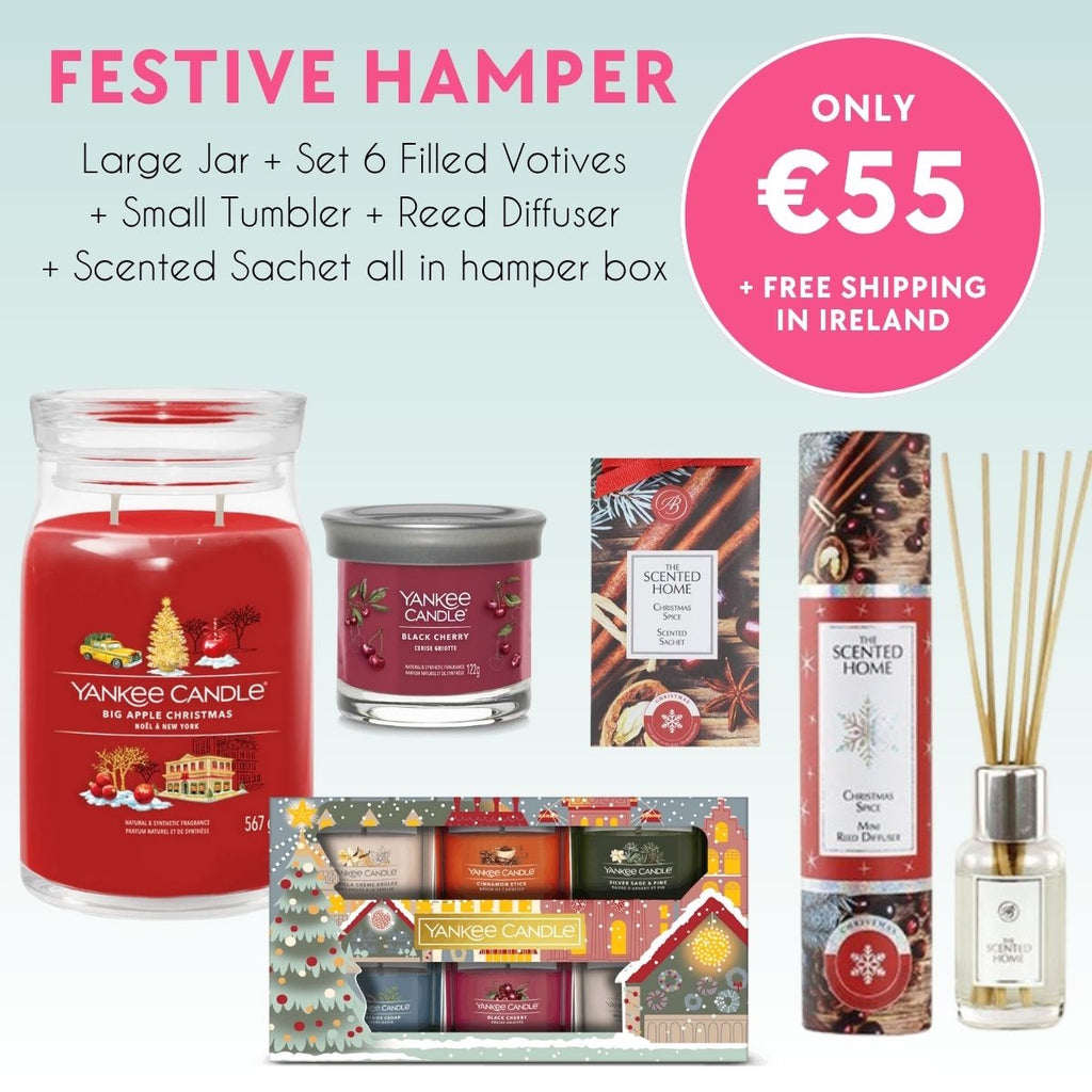 Hampers contain - Yankee Large Jar + Yankee Gift Pack of 6 filled votives + Yankee small tumbler + Ashleigh & Burwood Christmas Spice reed diffuser + Christmas spice fragrance sachet.