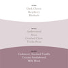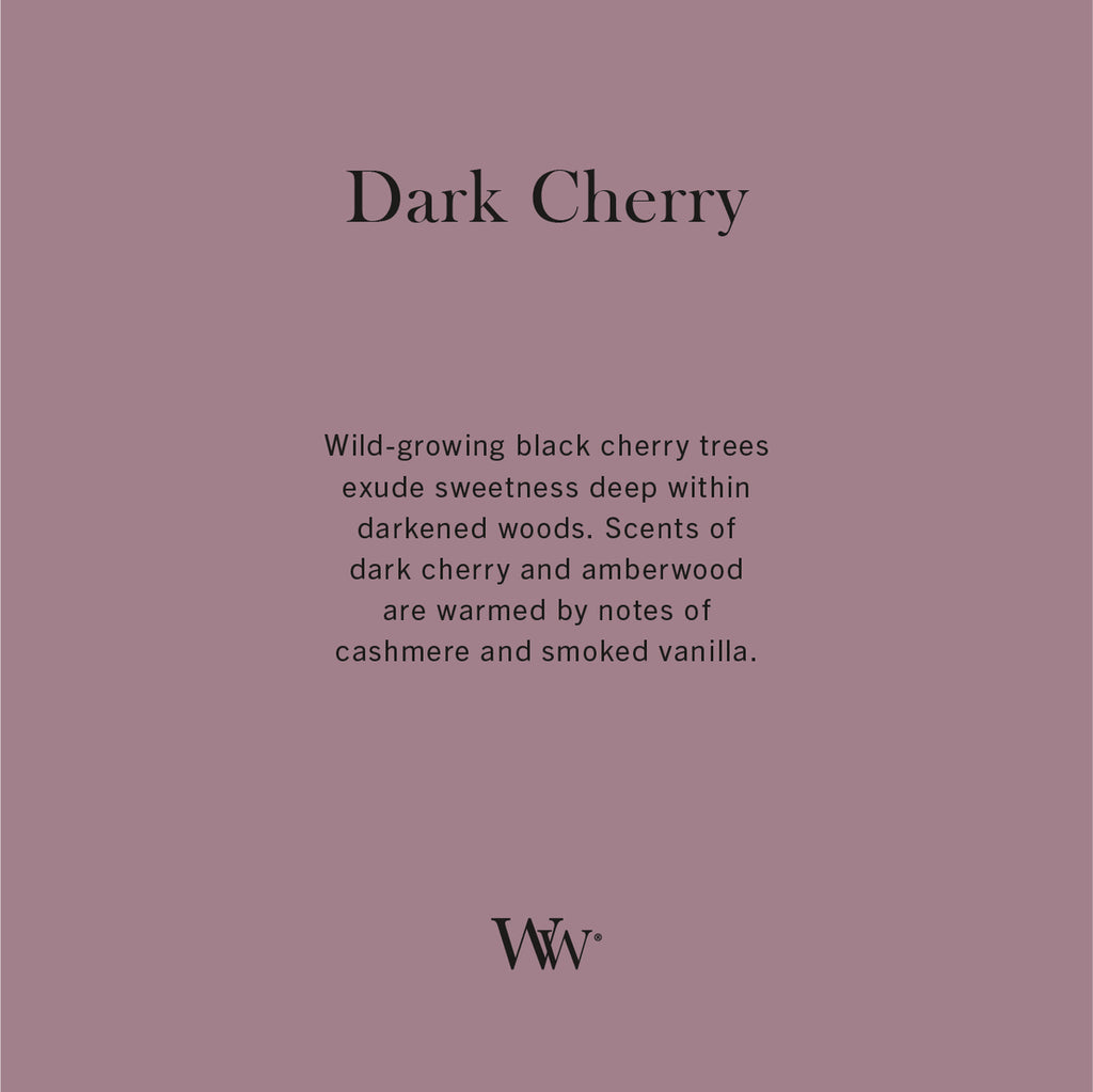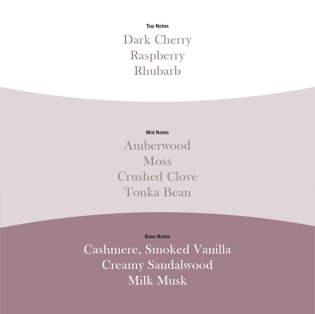 Invite the aroma of wild-growing black cherry trees exuding sweetness deep within darkened woods into your home as scents of dark cherry and amberwood are warmed by notes of cashmere and smoked vanilla in a deeply fruity & indulgent fragrance.