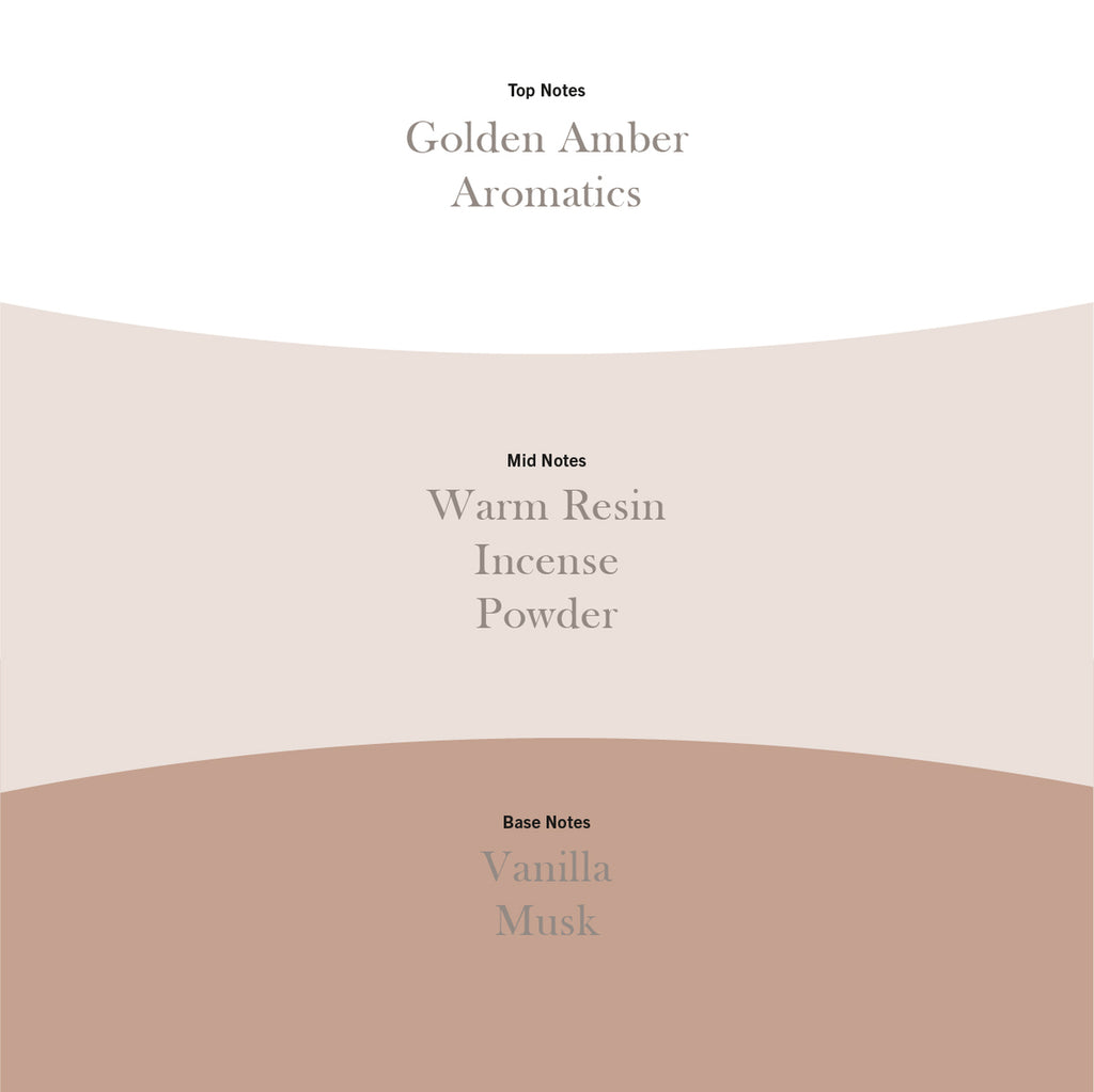 Notes of golden amber, smoky incense, and vanilla bean radiate as one to create the feeling of basking in warm sunlight.