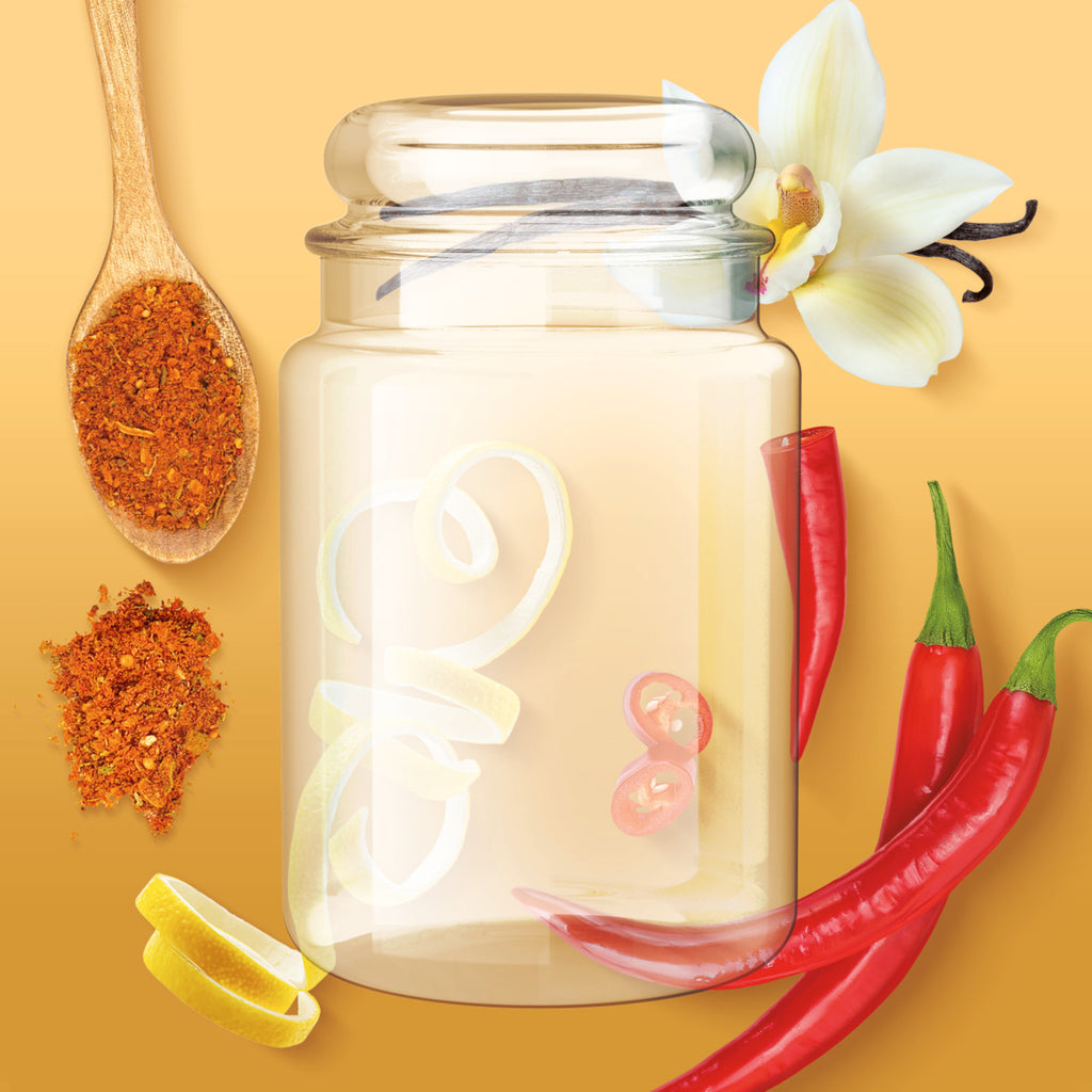 This fresh and energetic scent combines sparkling lemon zest with a spicy accent of cayenne pepper, rounded off with a creamy touch of vanilla. A vibrant fragrance that instantly evokes sunny days and long summer evenings.