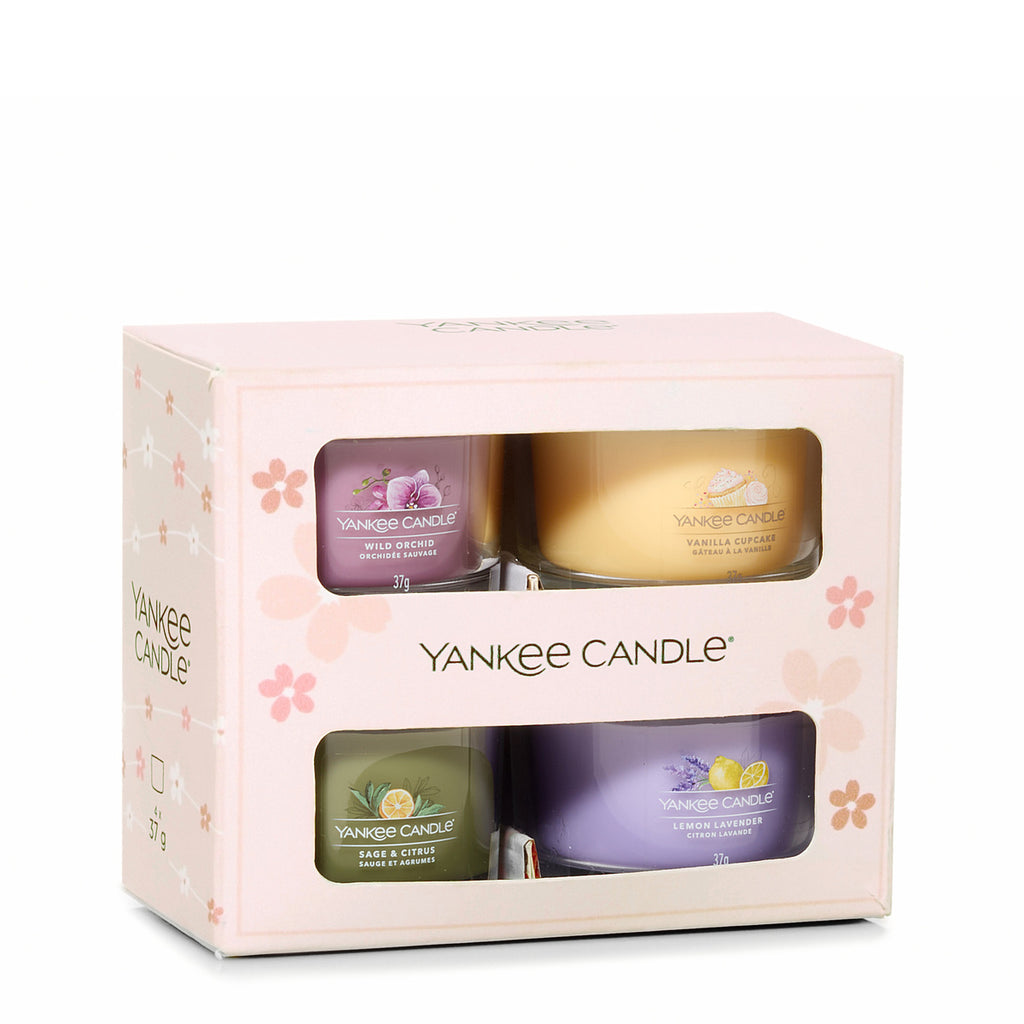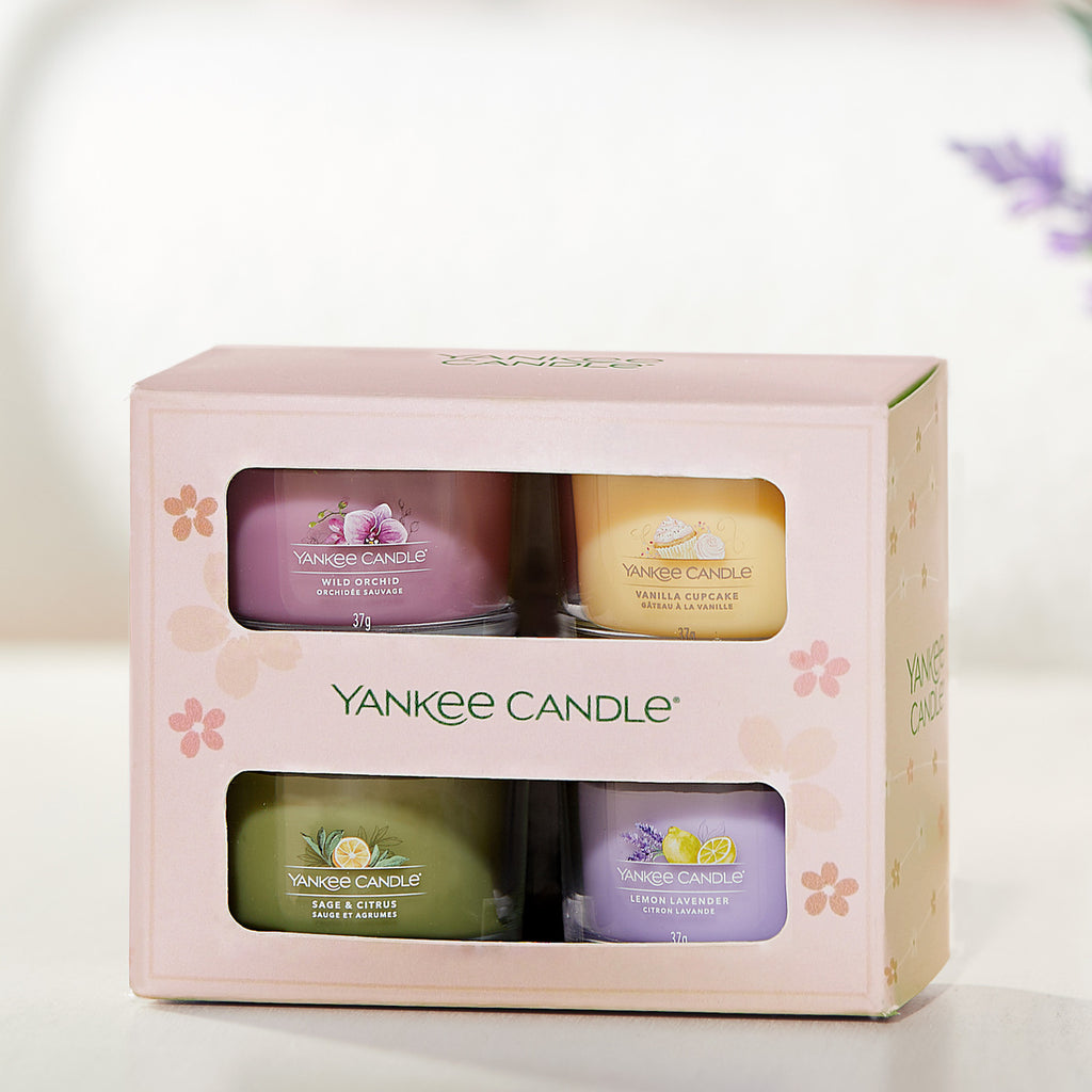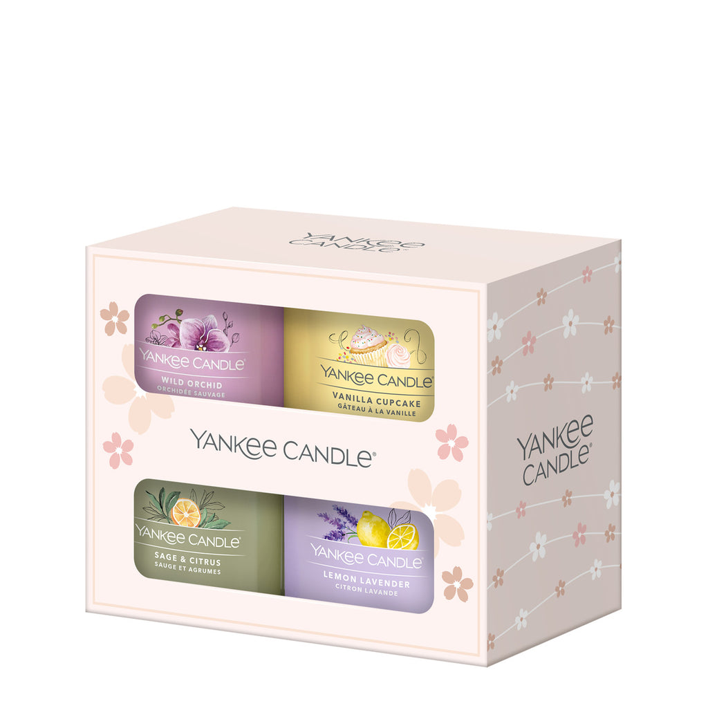 Treat yourself or someone special to a moment of calm with this beautifully curated gift set, containing four Yankee Candle® Mini Filled Votives scented in Wild Orchid, Vanilla Cupcake, Lemon Lavender and Sage & Citrus.